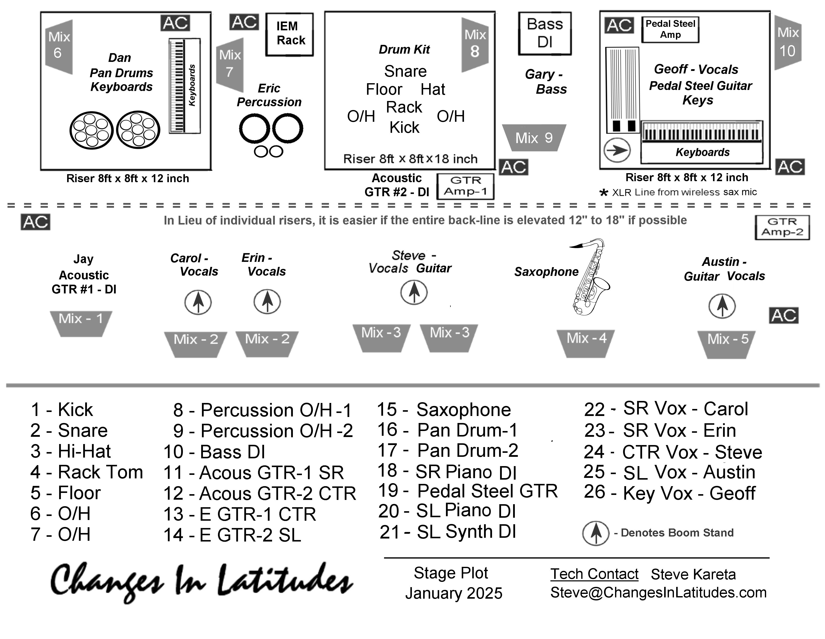 Technical Information For promoters, production managers and sound companies >Stage Plot< >IEM Spec Sheet< >Input List< >Event Rider<
